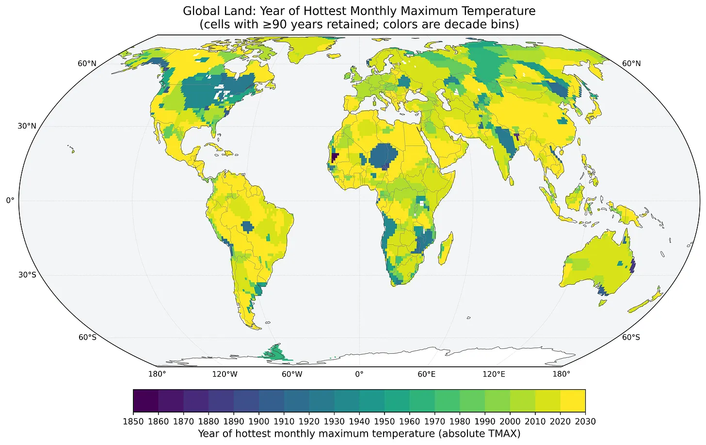 "The figure below, which shows the percent of the world’s land that set a record in each decade, makes it clear that the vast majority of the Earth’s surface has seen a record set recently; indeed, 38% of the land surface has set a new record in the 2020s, despite the decade being incomplete. Overall, around 78% of the land surface area has seen a new all-time monthly high record set after the year 2000."